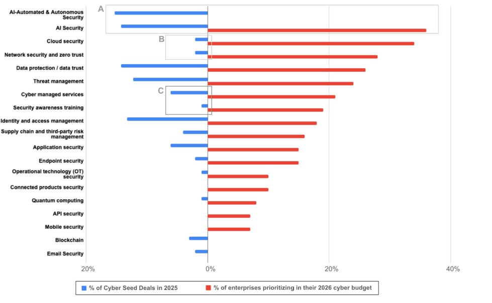 To answer that, we compared the types of cyber startups raising seed capital in 2025 with where enterprises say they plan to allocate cyber budgets in 2026.