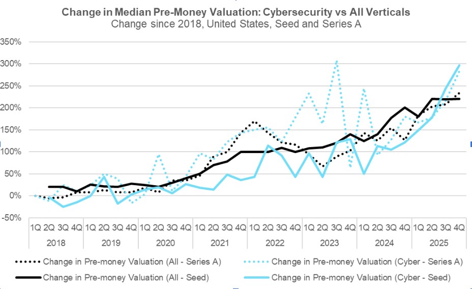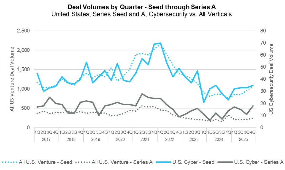At the early stage, the picture remains bifurcated. Deal volumes at seed and Series A improved during the quarter, with seed activity surpassing 1,000 deals for the first time since mid-2023 and cybersecurity continuing to outperform the broader venture market. Investor selectivity, however, remains elevated, particularly at Series A. Founders who successfully secure funding are commanding substantial valuation premiums, while many others face a more difficult path forward. This combination of rising valuations and constrained deal flow continues to define the early-stage environment heading into 2026.